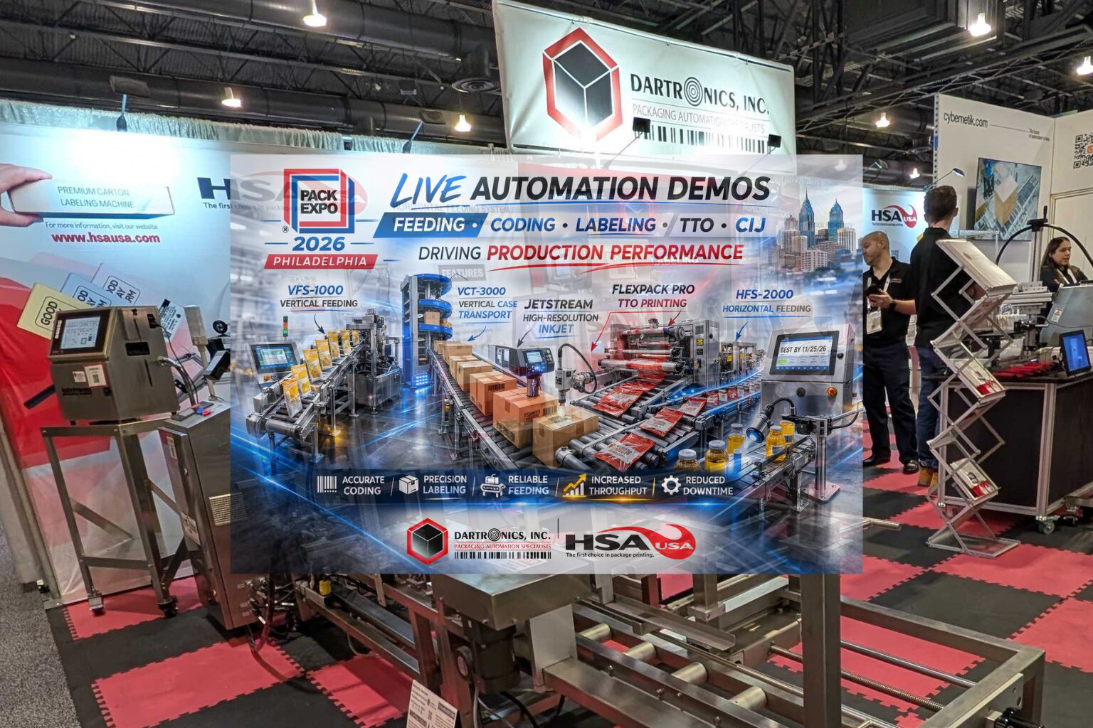 PACK EXPO 2026 in Philadelphia wasn’t about static displays — it was about live, integrated automation systems solving real production challenges. At Booth #1200, Dartronics and HSAUSA demonstrated feeding systems, vertical case transport, thermal transfer overprinting, barcode verification, vision inspection, and high-speed continuous inkjet coding — all running in real time.